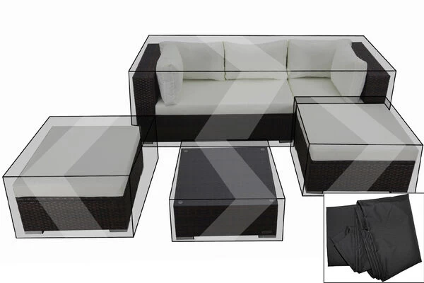 Dieses 4-teilige OUTFLEXX® Premium Abdeckhauben-Set in Schwarz besteht aus 100% Polyester mit einer Stärke von ca. 170g/m². Sie sind mit einer PU-Beschichtung versehen, die sie wasserbeständig und uv-stabil macht. Damit schützen Sie Ihre wertvolle Polyrattan Loungegarnitur zuverlässig vor Staub, Verschmutzung und Nässe. Die Schutzhüllen sind mit einem stabilen Zugband versehen und lassen sich so fest verzurren. Dadurch können Sie Ihre Gartenmöbel besonders gut vor Witterungen wie Sonne, Regen, Sturm oder Schnee schützen.