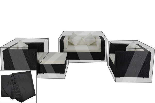 Dieses 4-teilige OUTFLEXX® Premium Abdeckhauben-Set in Schwarz besteht aus 100% Polyester mit einer Stärke von ca. 170g/m². Sie sind mit einer PU-Beschichtung versehen, die sie wasserbeständig und uv-stabil macht. Damit schützen Sie Ihre wertvolle Polyrattan Loungegarnitur zuverlässig vor Staub, Verschmutzung und Nässe. Die Schutzhüllen sind mit einem stabilen Zugband versehen und lassen sich so fest verzurren. Dadurch können Sie Ihre Gartenmöbel besonders gut vor Witterungen wie Sonne, Regen, Sturm oder Schnee schützen.