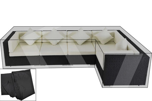 Diese OUTFLEXX® Premium Abdeckhaube in Schwarz besteht aus 100% Polyester mit einer Stärke von ca. 170g/m². Sie ist mit einer PU-Beschichtung versehen, die sie wasserbeständig und uv-stabil macht. Damit schützen Sie Ihre wertvolle Polyrattan Loungegarnitur zuverlässig vor Staub, Verschmutzung und Nässe. Die Schutzhülle ist mit einem stabilen Zugband versehen und lässt sich so fest verzurren. Dadurch können Sie Ihre Gartenmöbel besonders gut vor Witterungen wie Sonne, Regen, Sturm oder Schnee schützen.