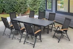 9-teilige Esstischgarnitur von OUTFLEXX® aus Aluminium/Textilene in OUTFLEXX® anthrazit matt/grau, Premium Ausziehtisch 180/240x100x76cm, inkl. 8 Multipositionssessel mit recyceltem FSC®-Teakholz