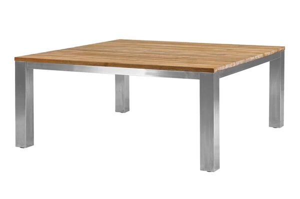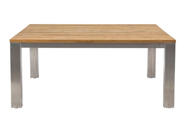 Das verwendete recycelte Teakholz verleiht diesem quadratischem Tisch einen ganz besonderen Charme. Die rustikal gebürstete Oberfläche sorgt dafür, dass die natürliche Struktur des Holzes erhalten bleibt und die Maserung besonders gut zum Vorschein kommt. Das Zusammenspiel aus dieser rustikalen Oberfläche und dem edlen 304er Edelstahl, verleiht dem Tisch sein besonderes Aussehen und sorgt dafür, dass er sich zu nahezu jeder Garteneinrichtung harmonisch kombinieren lässt. Mit den Maßen von ca. 160 x 160 x 75 cm bietet er ausreichend Platz für 4-8 Personen.