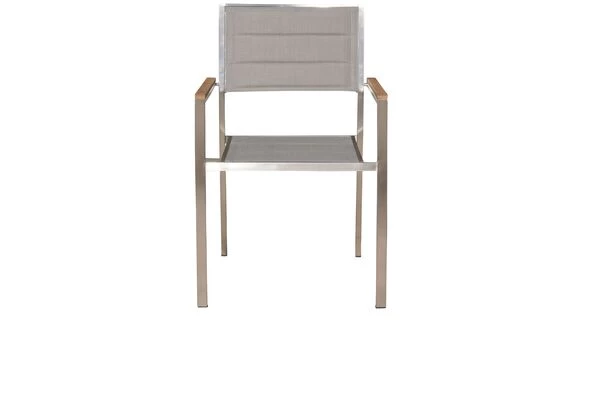OUTFLEXX® Stapelstuhl aus Edelstahl und Textilene in Silber, padded, mit Armlehnen aus FSC-Teakholz