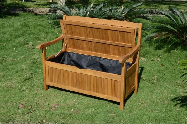 Das Akazienholz wird bei dieser Aufbewahrungsbank mit witterungsbeständigen Zinkbeschlägen und einer Innentasche aus Polypropylen kombiniert. Polypropylen gehört zu einer Kunststoffgruppe. Es zeichnet sich mit einer Vielzahl an positiven Eigenschaften aus. Polypropylen ist sehr widerstandfähig, wärmebeständig und nimmt so gut wie keine Feuchtigkeit auf.