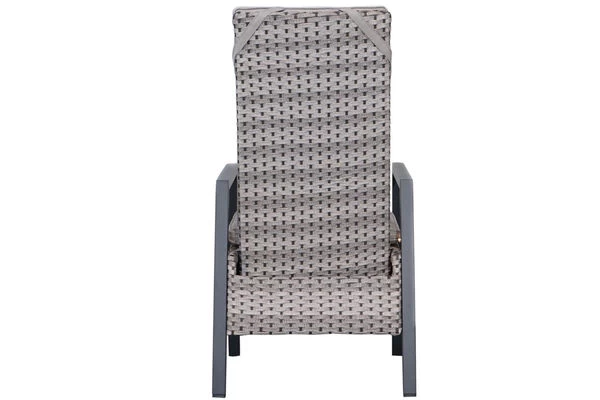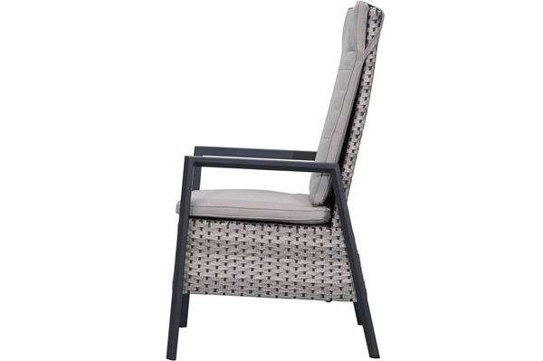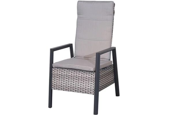 Das Untergestell besteht aus pulverbeschichtetem Aluminium in der Farbe Anthrazit. Dies macht es nicht nur stabil, sondern sorgt auch dafür, dass sich der Sessel aufgrund des relativ geringen Gewichts ganz leicht hin und her stellen lässt. Das Aluminiumgestell wird mit Polyrattangeflecht bespannt. Der flach-halbrunde Geflechtmix ist in der Farbe natur-anthrazit gehalten und schafft so helle und freundliche Momente in allen möglichen Terrasseneinrichtungen. Gemütliche Sitz- und Rückenpolster mit Olefinbezug sorgen für höchsten Sitzkomfort. Farblich sind die graufarbenen Polster mit Quernähten perfekt auf das Geflecht abgestimmt.