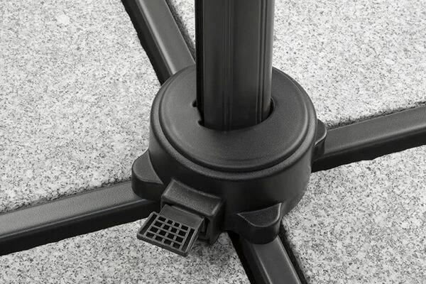 Der zweiteilige Mast aus Aluminium mit den Maßen von ca. 67 x 50 mm ist überdurchschnittlich stabil und trotzt den verschiedensten Witterungseinflüssen. Die 8 eingebauten Dachstreben aus Stahl mit den Maßen von ca. 22 x 13 mm sorgen zusätzlich für weitere Standfestigkeit. Zusätzlich zu diesem Ampelschirm erhalten Sie einen Plattenständer für Wegeplatten. Damit der Schirm sicher steht, beschweren Sie den Plattenständer mit Wegeplatten und auch hier macht sich das geringere Gesamtgewicht bemerkbar, denn zum Beschweren reicht nun ein Mindestgewicht von ca. 100 kg (Bitte beachten Sie: die Wegeplatten sind nicht im Lieferumfang enthalten!).