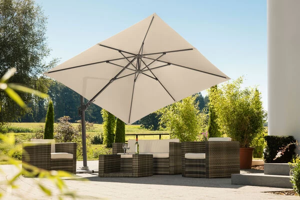 Der quadratische Sonnenschirm Rhodos Twist besticht durch seine hochwertig verarbeiteten Materialien und seine praktischen Funktionen. Das ca. 300 x 300 cm große Schirmtuch besteht aus 100% Polyester (ca. 200 g/m²) und ist verrottungsfest und wasserabstoßend imprägniert. Dieses Schirmtuch trägt die Farbe natur und ist damit zeitlos und integriert sich unaufdringlich in Ihren Garten oder Terrasse. Die mitgelieferte Schutzhülle bietet einen zusätzlichen Schutz vor Schmutz im eingefahrenen Zustand. Das Gestell des Schirms besteht aus hochwertigem pulverbeschichtetem Aluminium in anthrazitgrau. Pulverbeschichtetes Aluminium ist zusätzlich vor Korrosion geschützt und weist kratzfeste, schlagfeste und witterungsfeste Eigenschaften auf.