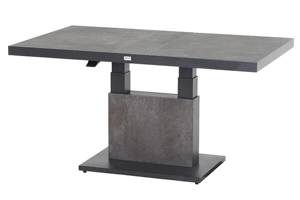 Der rechteckige Lifttisch Bellani bietet Ihnen und Ihren Lieben optimalen Komfort und verwandelt jedes gesellige Miteinander in ein Fest. Lassen Sie sich von der Robustheit und einzigartigen Qualität, kombiniert mit dem modernen und funktionalen Design begeistern. Der praktische Tisch ist ein wahres Multitalent, er ist ideal als Kaffee- und Esstisch einsetzbar. Er bietet mit Maßen von ca. 140 x 85 x 50/72 cm großzügig Platz für bis zu 4 Personen – so steht einem leckeren Brunch oder einem gemütlichen Kaffeekränzchen nichts im Wege. Durch einen Hebel unterhalb der Tischfläche können Sie den Tisch problemlos mittels eines Hydrauliksystems stufenlos höhenverstellen. Der Tischunterbau besteht aus Keramikplatten in dunkelgrau. Das Gestell wurde aus pulverbeschichtetem Aluminium in matt anthrazit hergestellt. Die Tischplatte in dunkelgrau ist aus Keramik und dadurch robust, pflegeleicht und dazu noch wetterfest – ideal für die Nutzung im Outdoor- und Innenbereich.