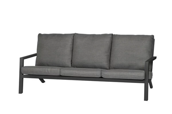 Bei dieser Loungegarnitur ist Stilechtheit und Komfort vorprogrammiert. Das Sofa präsentiert sich mit einem schlichtem, pulverbeschichteten Aluminiumgestell und bietet drei Personen bei einer Breite von ca. 210 cm genügend Platz. Die Sitz- und Rückenkissen in Grau aus 100% Polypropylen (230 g/m²) sorgen für den Komfort auf dem Sofa. Bei Verschmutzung können Sie die Bezüge abnehmen und von Hand waschen. Nicht nur als Einzelstück ein Highlight, sondern ganz besonders in Kombination mit dem Loungetisch und Loungesessel Belia ein echter Hingucker.