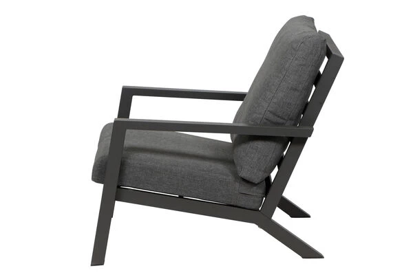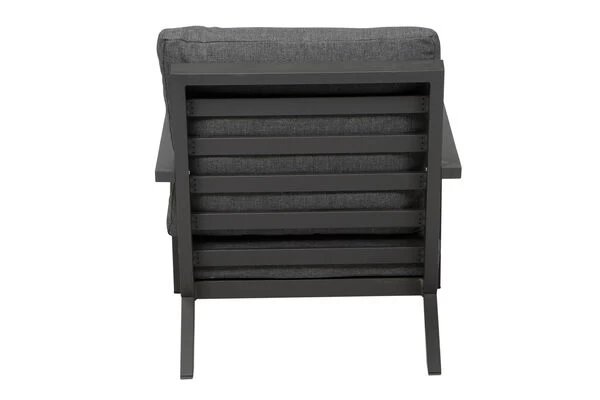 Der wetterfeste und pflegeleichte Loungesessel bietet höchsten Sitzkomfort gepaart mit modernem Design. Die praktischen ca. 50,6 cm hohen Armlehnen aus Aluminium bieten zusätzlichen Komfort. Der Sessel hat ein Gesamtmaß von ca. 79 x 91 x 81 cm, die Sitzfläche ist ca. 65 cm breit, ca. 60,5 cm tief und die Sitzhöhe liegt bei ca. 30 cm, die perfekte Loungehöhe. Bei Wind und Wetter sorgt die Witterungsbeständigkeit und Pflegeleichtigkeit der verwendeten Materialien für den nötigen Schutz. Das Gestell des Sessels besteht aus pulverbeschichtetem Aluminium in matt-anthrazit. Aluminium macht den Sessel nicht nur stabil, sondern – mit ca. 11,6 kg Gewicht – auch sehr leicht. Für noch mehr Komfort sorgen Sitz- und Rückenkissen aus 100 % Polypropylen (230 g/m²), die in dunkelgrau farblich passend auf das Gestell abgestimmt und mit einem Reißverschluss ausgestattet sind. So können Sie den Bezug bei leichten Verschmutzungen einfach abziehen und per Hand waschen. Praktische Fußkappen bestehen aus schwarzem Kunststoff und schützen den Boden vor unschönen Kratzern beim Verrücken des Möbelstücks.