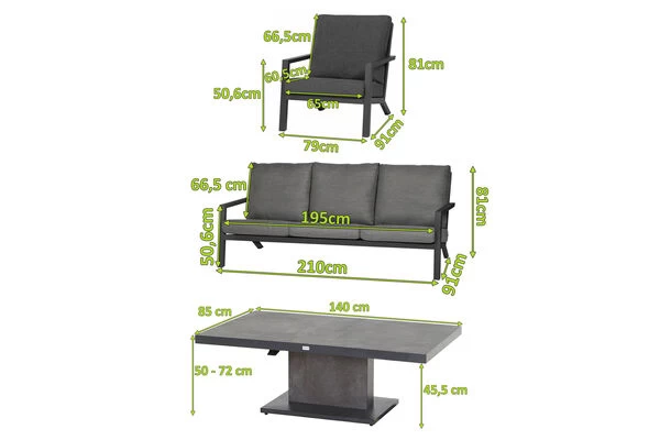 SIENA GARDEN Belia/Bellani Loungemöbel, matt anthrazit/grau, Alu/Keramik, Lifttisch 140×85 cm, 1x 3-Sitzer, 2 Sessel