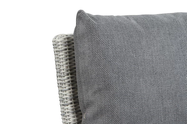 | Stabiles Polyrattan-Geflecht Das halbrunde Polyrattan-Geflecht GARDINO® in der Farbe ice grey zeichnet sich besonders durch seine Lichtechtheit und Stabilität aus. Es ist zudem besonders wasserabweisend und wetterfest. Das robuste Material schützt das Möbelstück somit bestens vor Witterungseinflüssen. |