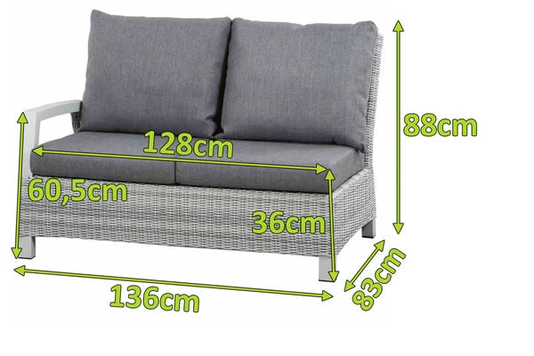 Einfach zurücklehnen und entspannen. Egal ob Sie die Beine hochlegen und ein gutes Buch in der Sonne lesen, gemütlich zusammen mit Freunden ein Kaffeekränzchen halten oder in gepflegter Atmosphäre den Alltag gemächlich an sich vorbeiziehen lassen möchten. Dieser bequeme 2-Sitzer mit einem Gesamtmaß von ca. 83 x 136 x 88 cm ist der ideale Begleiter und lädt Sie jederzeit zum Verweilen ein. Die ca. 128 cm breite Sitzfläche bietet genügend Platz für 2 Personen. Mit einer großzügigen Sitztiefe von ca. 63,5 cm und bei einer Sitzhöhe von ca. 36 cm ohne Kissen lässt es sich herrlich entspannen, allein oder zu zweit. Die praktische Armlehne auf der rechten Seite bietet zusätzlichen Komfort und ist zudem ein echter Hingucker. Passende, extra starke Kissen in der Trendfarbe „stone grey“ verleihen dem Sitzmöbel ein unvergleichliches Sitzerlebnis.