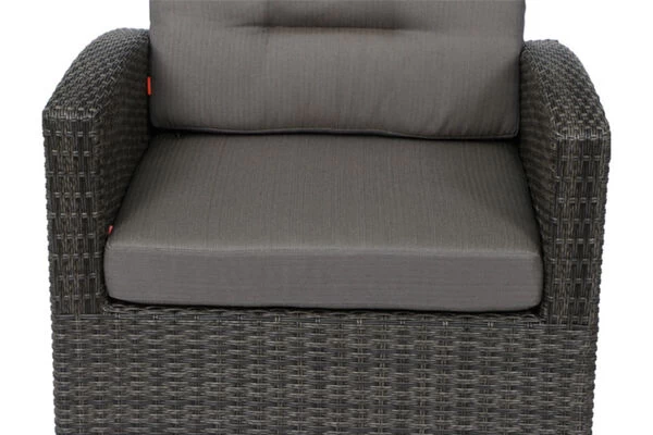 Das Untergestell des Möbelstücks besteht aus pulverbeschichtetem Aluminium, dies macht es nicht nur stabil, sondern sorgt auch dafür, dass es sich aufgrund des relativ geringen Gewichts (ca. 11,06 kg) ganz leicht hin und her stellen lässt. Das Aluminiumgestell wird mit doppelhalbrundem GARDINO®-Geflecht bespannt. Die Basis dieses Geflechts bildet der Kunststoff Polyethylen. Durch die geringe Feuchtigkeitsaufnahme dieser Faser trocknet sie besonders schnell und ist dadurch schmutzunempfindlich. Zudem zeichnet sie sich durch eine natürliche Optik aus und erzeugt eine edle und moderne Ausstrahlung. Der moderne Grauton der Faser passt perfekt zu den meisten Einrichtungsstilen und Gartengestaltungen. Gemütliche Sitz- und Rückenpolster und das gestreifte Dekokissen (100 % Polypropylen (280 g/m²)) sorgen für höchsten Sitzkomfort. Farblich sind die grauen Polster perfekt auf das Geflecht abgestimmt.