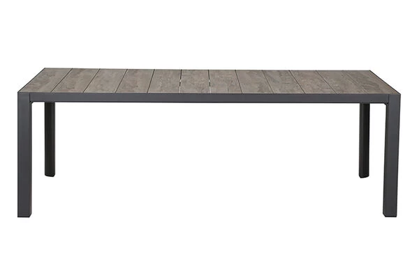 Wer das Besondere liebt ist mit diesem Esstisch bestens bedient. Der Tisch bietet mit seinen Maßen von ca. 220 x 100 x 74 cm Platz für 8-10 Personen – so steht dem gemütlichen Mittagessen mit der Familie nichts mehr im Wege. Das Gestell wurde aus pulverbeschichtetem Aluminium in matt anthrazit hergestellt, was den Tisch besonders haltbar macht. Die Tischplatte besteht aus hochwertigem Keramik in Holzoptik in der Farbe washed grey, während die dreieckig geformten Tischbeine für ein weiteres optisches Highlight sorgen. Die Unterschubhöhe beträgt ca. 68 cm – so kann man gemütlich mit vielen Arten von Sesseln an diesem Tisch Platz nehmen. Der Tisch hat ein Gewicht von ca. 64 kg, und ist somit perfekt gegen Windstöße geschützt. Die Fußkappen bestehen aus schwarzem Kunststoff und schützen den Boden vor unschönen Kratzern beim Verrücken des Möbelstücks.