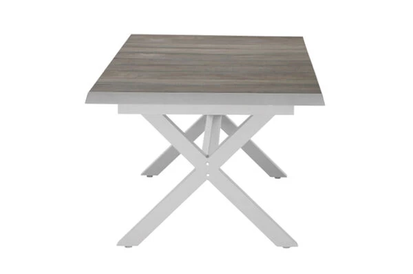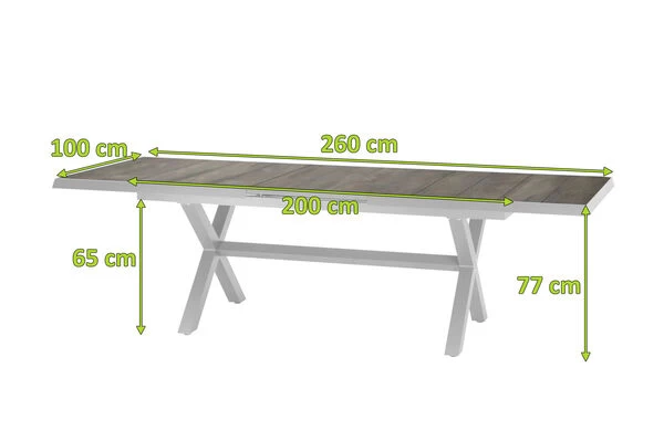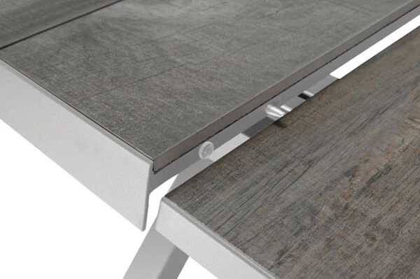 Wer in größeren Dimensionen denkt ist mit diesem Tisch bestens bedient. Der Tisch bietet mit seiner rechteckigen Form und Maßen von ca. 200 x 100 x 77 cm Platz für einen gemütlichen Nachmittag mit Ihrer Familie in der Sonne. Der Tisch lässt sich durch Ziehen an beiden Seiten und Hochklappen der integrierten, mittleren Tischplatte bis auf eine Länge von ca. 260 cm ausziehen – perfekt, wenn sich noch spontaner Besuch ankündigt oder Sie einen schönen Grillabend mit Freunden und Nachbarn planen. Das Gestell wurde aus pulverbeschichtetem Aluminium in matt weiß-grau hergestellt, was den Tisch besonders haltbar macht. Die Tischplatte in washed grey besteht aus hochwertigem Keramik und besitzt eine Stärke von ca. 10 mm. Die quadratisch geformten Tischbeine sorgen für ein weiteres optisches Highlight. Die Fußkappen bestehen aus weiß-grauem Kunststoff und schützen den Boden vor unschönen Kratzern beim Verrücken des Möbelstücks.