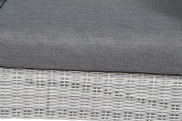 | Stabiles Polyrattan-Geflecht Das halbrunde Polyrattan-Geflecht GARDINO® in der Farbe ice grey zeichnet sich besonders durch seine Lichtechtheit und Stabilität aus. Es ist zudem besonders wasserabweisend und wetterfest. Das robuste Material schützt das Möbelstück somit bestens vor Witterungseinflüssen. |