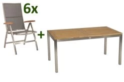 6x Multipositionssessel Cardiff, silber/silbergrau, Edelstahl/Textilene/FSC-Teakholz, ca. 69×60,5×110 cm (417476) 1x STERN Ausziehtisch, silber/natur, Edelstahl/FSC-Teakholz, ca. 162/220x90x75 cm, Butterfly-Auszug (417379)