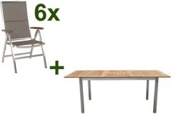 STERN Cardiff Esstischgruppe, silber/taupe, OUTFLEXX Ausziehtisch, FSC-Teak/Edelstahl, 6 Multipositionssessel