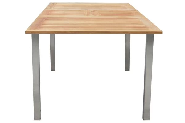 Die Tischplatte besteht aus ca. 2 cm starken Bohlen aus massivem, FSC-zertifiziertem Teakholz. Das Gestell aus hochwertigem 304er-Edelstahl gibt dem Tisch mit seinen ca. 5 x 5 cm starken Tischbeinen eine besonders hohe Stabilität. Die hochwertige Materialauswahl und die sorgfältige Verarbeitung sorgen nicht nur für die exklusive Optik dieses Ausziehtisches, sondern machen ihn mit einer Belastbarkeit von ca. 150 kg auch sehr stabil.
