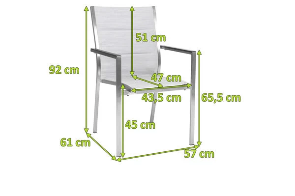 Der Sessel überzeugt nicht nur mit seinem zeitlosen Design und den hochwertigen Materialien, sondern vor allem auch durch seinen Komfort und seine Funktionalität. Schlicht, unauffällig und dennoch ein Hingucker. So lässt sich der Cardiff wohl am besten beschreiben. Holen Sie sich mit diesem Sessel Eleganz vereint mit perfektem Sitzkomfort nach Hause und genießen Sie entspannte Stunden z.B. nach Ihrem Feierabend. Die hochwertigen Materialien und die sorgfältige Verarbeitung sorgen nicht nur für die besondere Optik dieses Stuhls, sondern machen ihn auch äußerst stabil. Der Cardiff wird Ihnen durch seine hohe Widerstandsfähigkeit gegen Wind und Wetter viele Jahre Freude bereiten. Das verwendete Edelstahl der Güteklasse 304 ist rostfrei und ebenso wie das Textilgewebe der Sitzfläche und Rückenlehne besonders pflegeleicht. Die Sitzfläche hat die Farbe silber und ist gepolstert. Leichte Verschmutzungen lassen sich ganz einfach mit ein wenig Wasser wieder entfernen. Die Armlehnen wurden aus Aluminium gefertigt und besitzen die Farbe anthrazit. So können Sie sich guten Gewissens zurücklehnen und sich so richtig entspannen. Durch seine Stapelfunktion und den Maßen von ca. 61 x 57 x 92 cm lässt sich der Stuhl aber dennoch platzsparend verstauen, wenn Sie doch einmal etwas mehr Platz auf Ihrer Terrasse oder im Garten benötigen sollten.