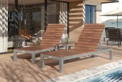 Die besonders schönen Sonnenliegen von Villana sind nicht nur ein echter Hingucker, sondern bieten Ihnen mit den Maßen von ca. 200 x 70 x 32,5 cm, einer maximalen Belastbarkeit von ca. 160 kg je Liege und einer 4-fach verstellbaren Rückenlehne optimalen Liegekomfort. So finden Sie immer die richtige Position und können es sich nach Ihren Wünschen gemütlich machen. Ein kleiner Beistelltisch mit den Maßen von ca. 45 x 45 cm ergänzt das Liegenset in Sachen Komfort. Mit einer angenehmen und bequemen Höhe von ca.45 cm fügt sich der Tisch nicht nur optisch wunderbar in das Gesamtbild ein, sondern erfüllt auch seinen Zweck. Trotz seiner überschaubaren Größe bietet er genügend Platz für Getränke und Ihr Lieblingsbuch. Sein Gestell besteht wie die Liegen aus pulverbeschichtetem Aluminium und wird mit einer Tischplatte aus FSC-Akazienholz kombiniert. Die Aluminium-Akazienholz Kombination findet sich sowohl im Beistelltisch, als auch in den Liegen wieder, sodass ein harmonisches Gesamtbild entsteht. Die FSC-Zertifizierung garantiert Ihnen, dass das Holz für die Möbel aus verantwortungsvollen Quellen stammt – Sie können sich also entspannt zurücklehnen und Ihr neues Sonnenliegen-Set guten Gewissens genießen.