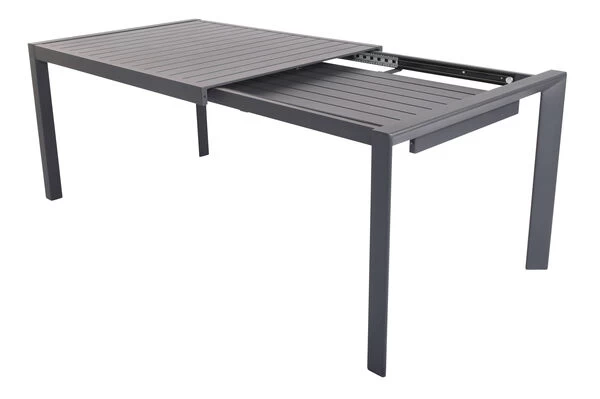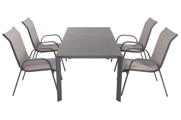 Diese Esstischgarnitur besteht aus 4 bequemen Sesseln und einem Ausziehtisch – perfekt, für eine kleine Runde aus Freunden, Familie oder Nachbarn. Bei Bedarf können Sie diese Gruppe mit passenden Artikeln der VILLANA Serie erweitern. Der optisch zeitlose Esstisch ist rein aus Aluminium gefertigt und besitzt eine Pulverbeschichtung in der Farbe Anthrazit. Aluminium ist ein gern verwendetes Material im Gartenmöbelsektor, da es besonders leicht, zeitgleich jedoch sehr stabil ist. Dazu kommt der geringe Pflegeaufwand durch die Pulverbeschichtung. Die meisten Verschmutzungen lassen sich unkompliziert mit Wasser aufweichen und anschließend abspülen oder mit einem weichen Schwamm entfernen. Zusammengefahren hat der Tisch bereits eine Größe von ca. 130 x 90 x 72 cm. Dabei hat der Tisch stets eine Unterkantenhöhe von ca. 68 cm – so können Sie die Stühle problemlos unter die Tischplatte schieben. Um die volle Größe des Tisches zu erhalten, ziehen Sie den Tisch einfach an der Auszugsseite aus. Unter der oberen Tischplatte kommt die Einlage zur Verlängerung der Tischplatte zum Vorschein. Diese müssen Sie manuell herausnehmen und auf das Gestell der Tischplatte legen. Letzlich werden durch das Zusammenschieben von Tischgestell und Einlegeplatte die Pins in die dafür vorgesehenen Löcher geschoben und es entsteht ein insgesamt größerer Tisch. Der ausgezogene Tisch weist nun eine Gesamtlänge von ca. 180 cm auf. Den Mechanismus finden Sie auch in der Bildergalerie des Sets. Der Clou: Im Gegensatz zu anderen Ausziehtischen haben Sie hier keine freischwebende Tischplatte, sondern die Tischplatte liegt bündig auf dem Untergestell auf. Die ca. 2 cm dicke Tischplatte bildet ein zuverlässiges Element des Tisches. Durch die geschickte Verarbeitung besitzt das Gestell eine besonders hohe Stabilität und dank des Gewichtes von ca. 22,7 kg ist der Tisch bis ca. 50 kg belastbar. Mit der Tischunterkante in Höhe von ca. 64,5 cm lassen sich die Stühle problemlos unter die Tischplatte schieben.