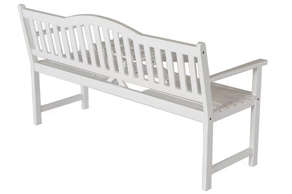 Aus Akazienholz hergestellt und mit einem weißen Landhaus-Anstrich versehen, wirkt diese Gartenbank äußerst einladend und unterstreicht gekonnt den skandinavischen Stil.